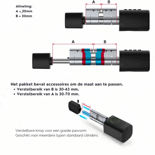 De Smart Deurslot Cilinder is een modern en betrouwbaar slim cilinderslot dat werkt via Bluetooth. Geen gedoe meer met sleutels: ontgrendel je deur eenvoudig met een vingerafdruk, pincode, IC-kaart, smartphone-app of de meegeleverde mechanische sleutel.